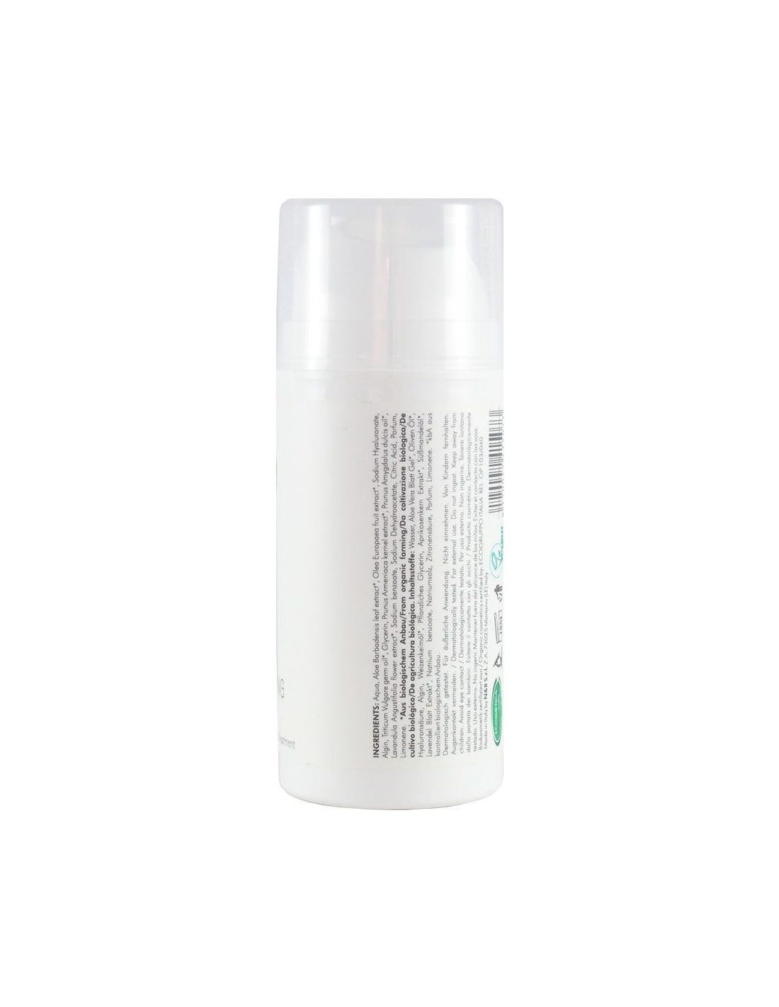Wasser, Aloe Vera Gel*, Olivenöl*, Hyaluronsäure, Algin, Weizenkeimöl*, pflanzliches Glycerin, Aprikosenkernöl*, Süßmandelöl*, Lavendelöl*, Konservierung Natriumsalz, Zitronensäure, Parfum, Limonene